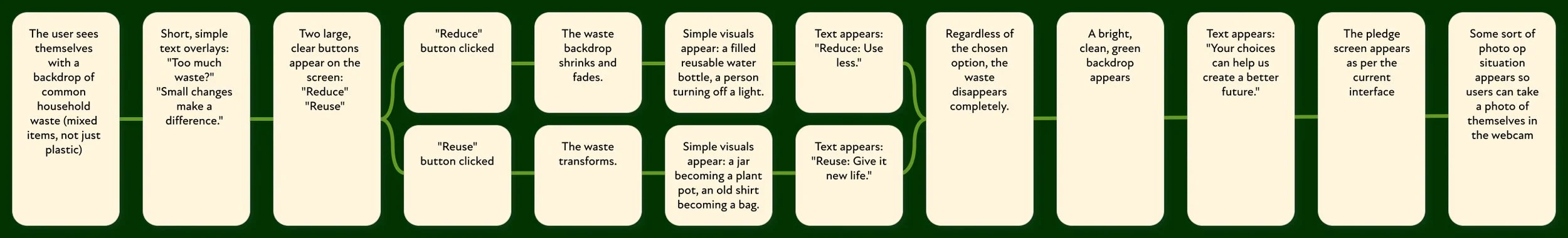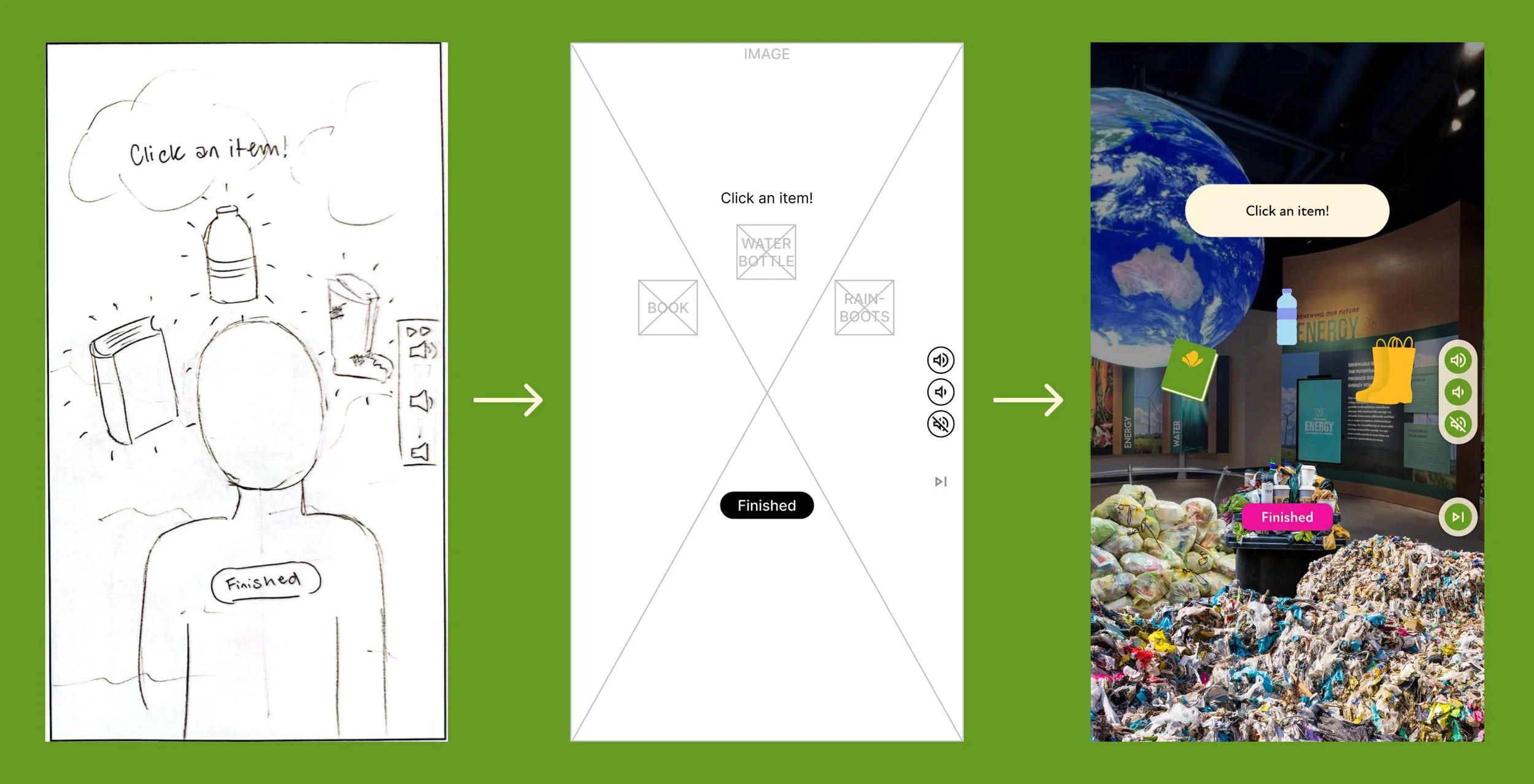 Every year, graduating UX students participate in a sequence of courses that allow them to create a digital experience for a real client: this year, the Peggy Notebaert Nature Museum, which needed their Sustainability Center, an exhibit that used large screens to deliver content related to sustainability across many domains of life, redesigned to better engage the visitors. My team and I worked with content related to Waste: after developing personas of museum visitors and creating a current vs. ideal user journey, our team decided to create an interactive experience that placed the user in a digital landfill and use their emotions to help them learn about how to make better choices related to waste. As UX designer on the team, I worked with one other to sketch, wireframe, and prototype the designs, each stage going through user testing before moving to the next. Finally, the team’s developer brought the designs to life, which were then placed in the museum.