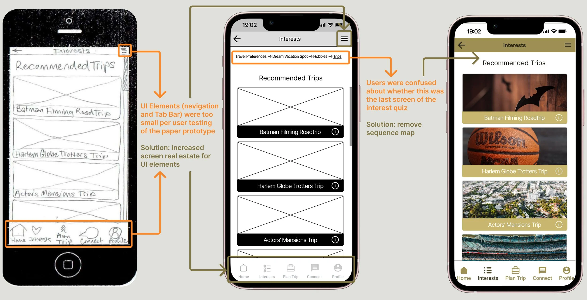 The pandemic had a profound impact on mental health and opportunities for older adults. Because of their increased risk related to COVID, their opportunities to travel, specifically, were much diminished. In 2022, after the world re-opened, my team and I were tasked with developing a travel app specifically for older adults. By looking at research on older adults, we narrowed down the functionality of our app: a trip planner that comes with recommendations and social connections. We iterated the design through different prototype fidelities: paper, wireframe, and high-fidelity prototype. To evaluate our design, we conducted usability testing and a heuristic evaluation. The main take-away from these evaluations is that older adults do not have the same technological understanding as younger audiences, which affects the way that we design.