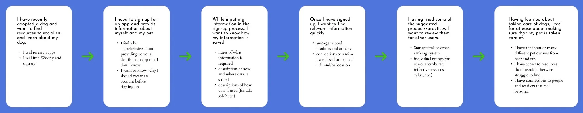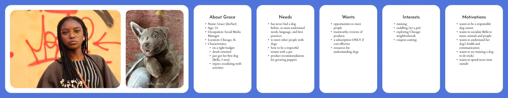 Pet ownership can be as stressful as it is rewarding: introducing Woofly, a one-stop shop for finding supplies, advice, activities, and other pet owners in your area. This project encouraged students to create and realize a concept for an application in functional prototypes. To begin, the idea having been decided, I developed personas for different possible users: the first time pet owner, the recently moved-in pet owner, and the owner of a medically complex pet. Each has different needs from the application, so I then created user flows for each persona to map out the functionality needed in the application. I wireframed the application’s layout while simultaneously developing the branding and design system. Finally, after receiving feedback from my professor and other students, I applied the design system to the reviewed wireframes.